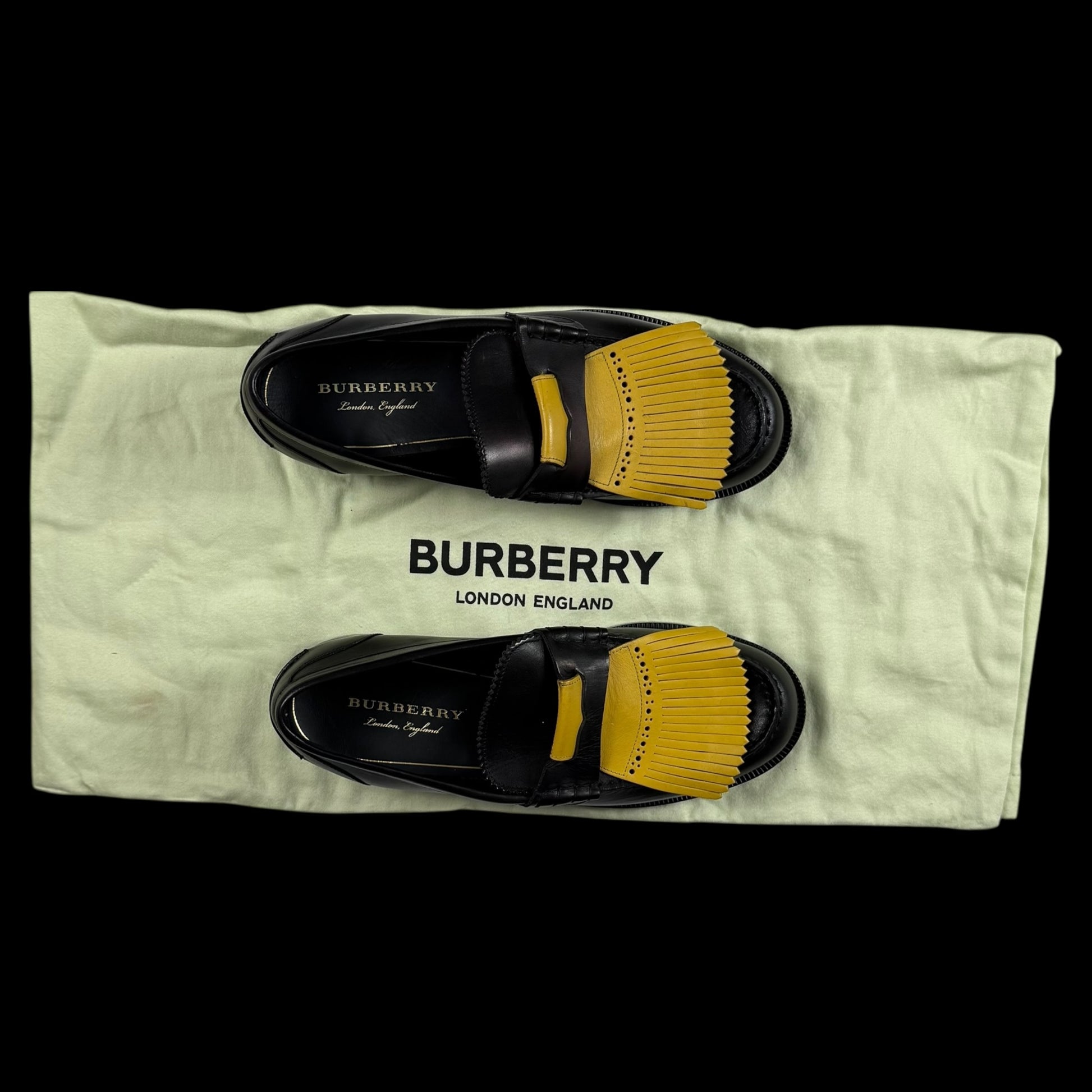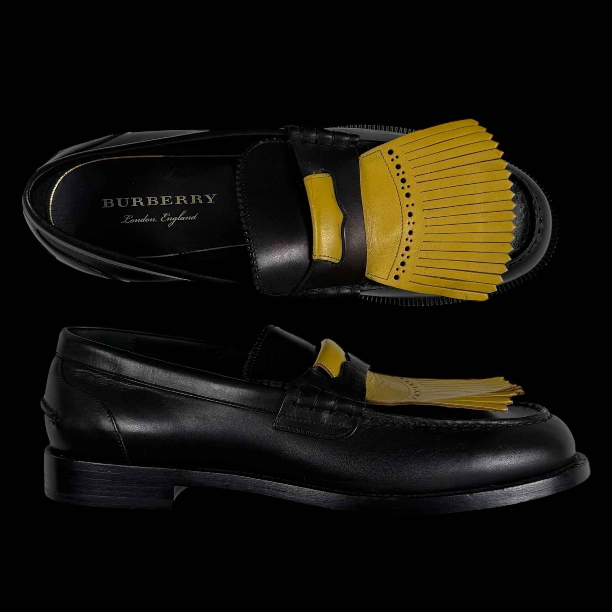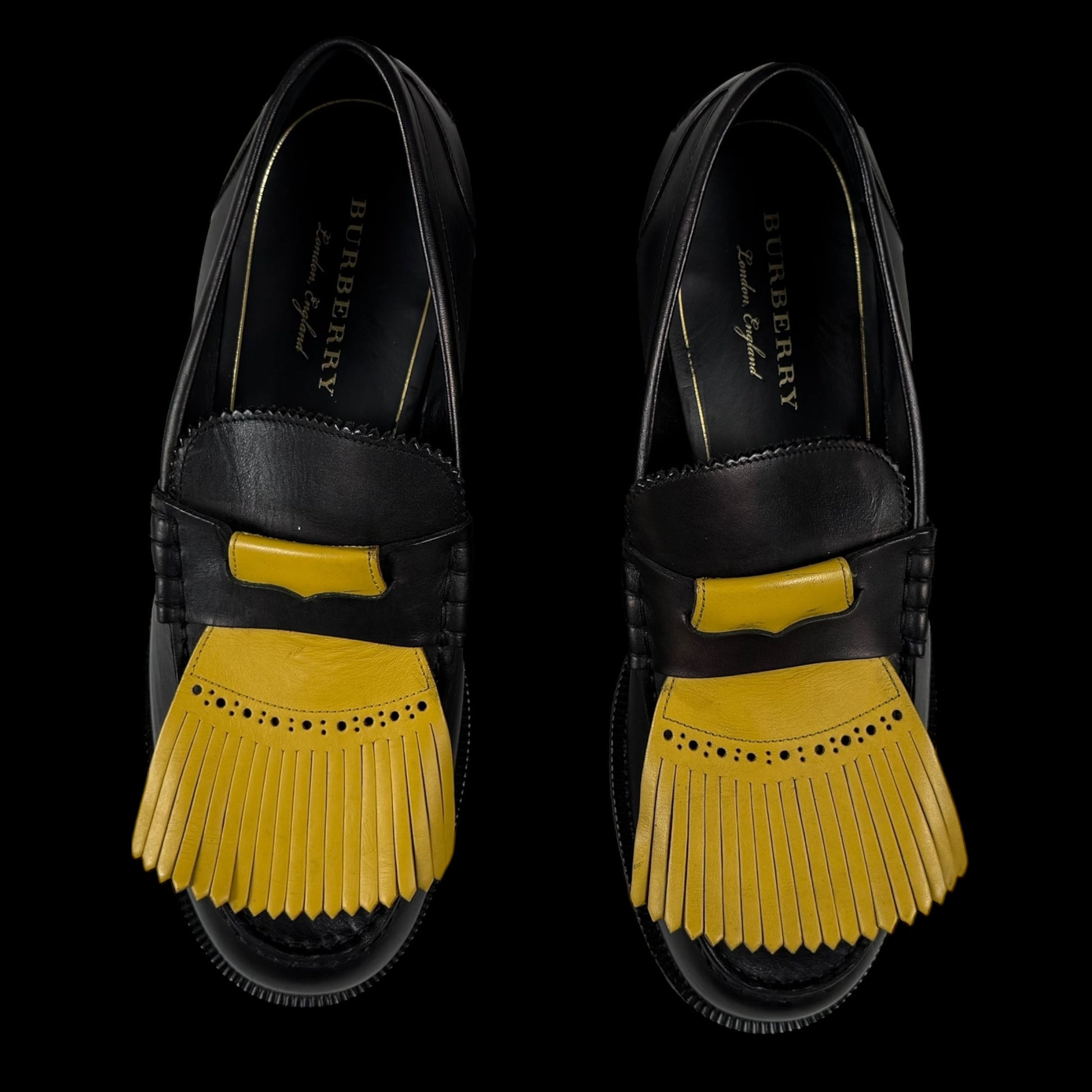 Burberry Kiltie Fringe Leather Loafers Black /Yellow (Fits US10.5-11)
